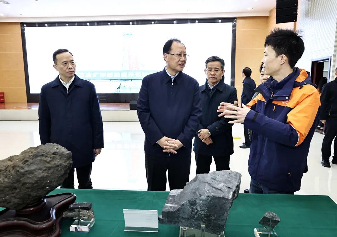 在省地质院,毛伟明一行走进湖南地质展厅,了解湖南矿产“家底”,查看省地灾监测预警与应急救援平台调度系统,视频连线平江万古金矿项目探矿现场。