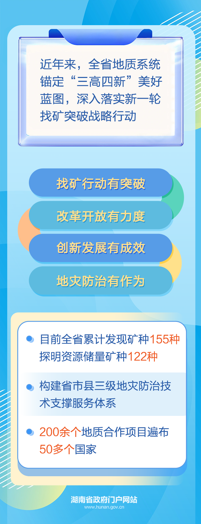 省委副书记、省长毛伟明来到省地质院调研并召开座谈会。他强调,要深入贯彻习近平总书记关于地质工作的重要指示批示精神以及关于湖南工作的重要讲话和指示批示精神,深入开展新一轮找矿突破战略行动,在生态安全、地灾防治等方面持续靠前发力,为奋力谱写中国式现代化湖南篇章作出更大地质贡献。